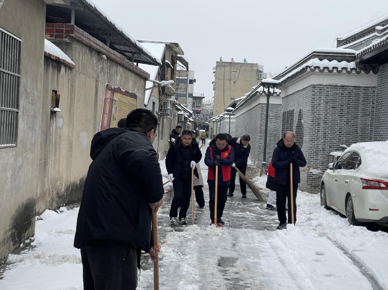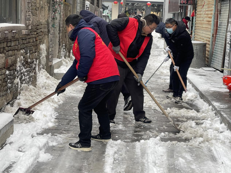 活动中,党员领导干部率先垂范,党员充分发挥先锋模范作用,以实际行动践行“我为群众办实事”的初心使命。干部职工分工协作,手持铁锹、扫帚等工具,顶风冒寒、干劲十足,有序破除压实冰层、清运积雪,同时提醒过往群众注意防滑,用细致服务传递暖意。